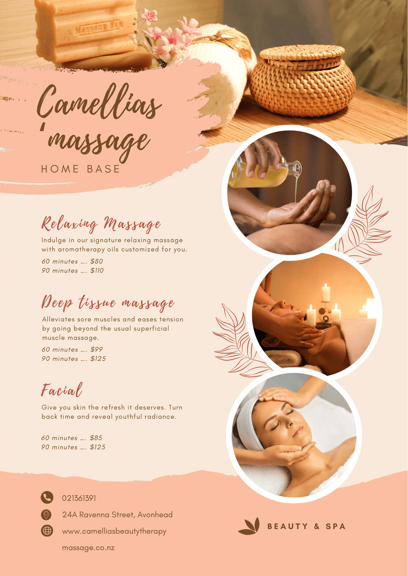 Nestled in the heart of Avonhead, Christchurch, Camellias Beauty Therapy Massage offers more than just treatments โ itโs your personal sanctuary for peace, balance, and radiant skin. Let stress melt away as you indulge in beauty and massage services tailored to your needs.